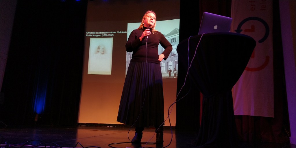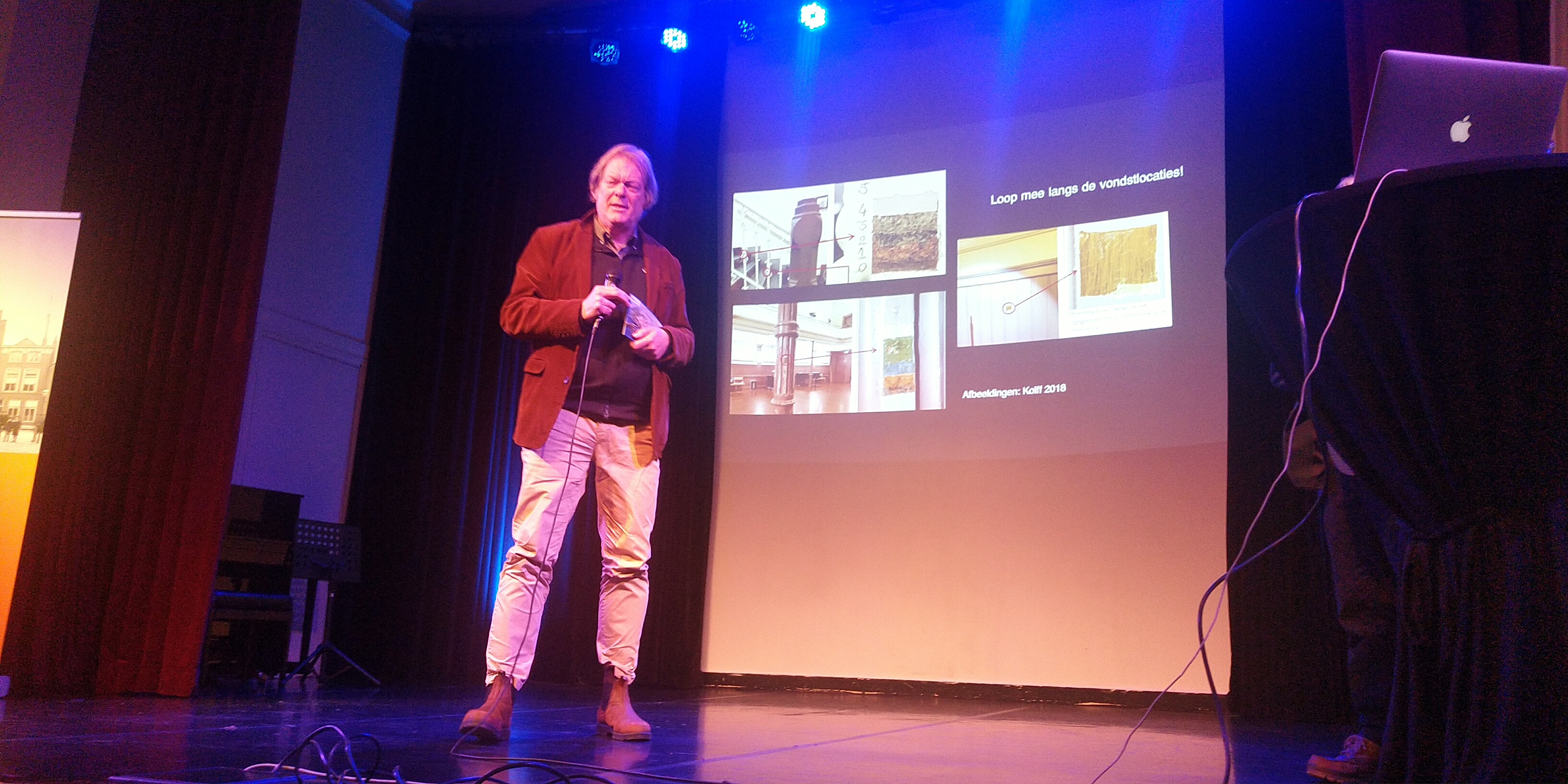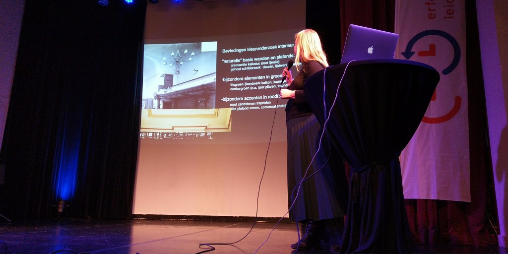 Inger Groeneveld, projectleider Historische Kleuren, heeft een toelichting gegeven over het kleurherstel in het Leidse Volkshuis. Dit rijksmonument uit 1899 kent een interessante geschiedenis, ook daar hebben we meer over gehoord en gezien.