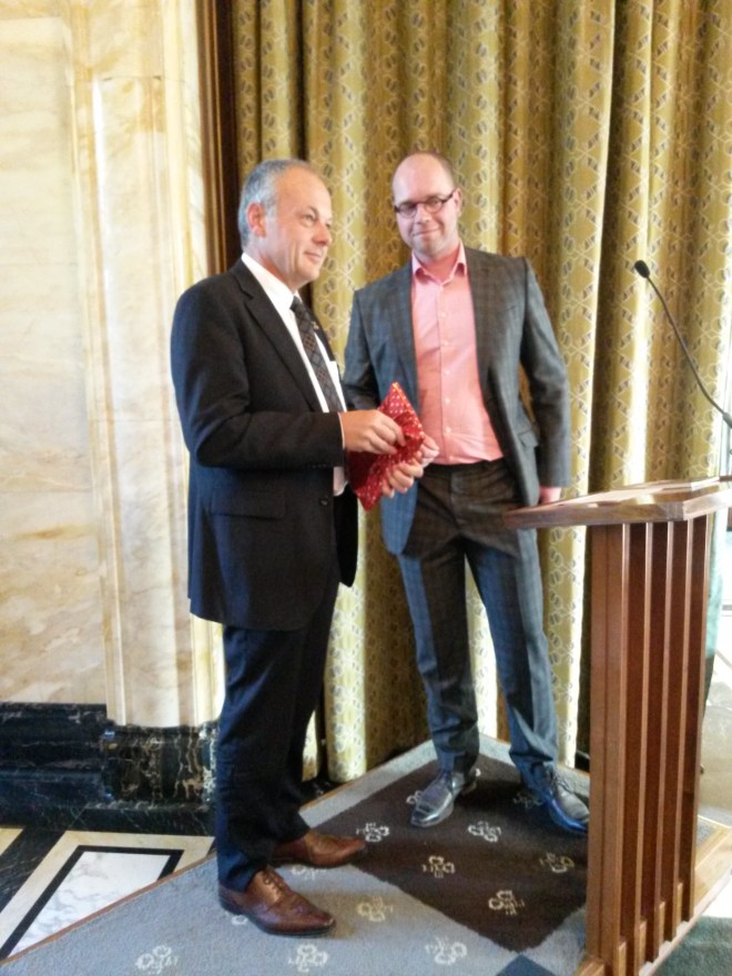 Martijn Andela van Erfgoed Leiden en Omstreken overhandigt burgemeester Lenferink het boekje ‘Het Stadhuis van Leiden. De restauratie van de bestuursverdieping’.