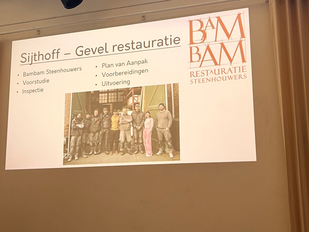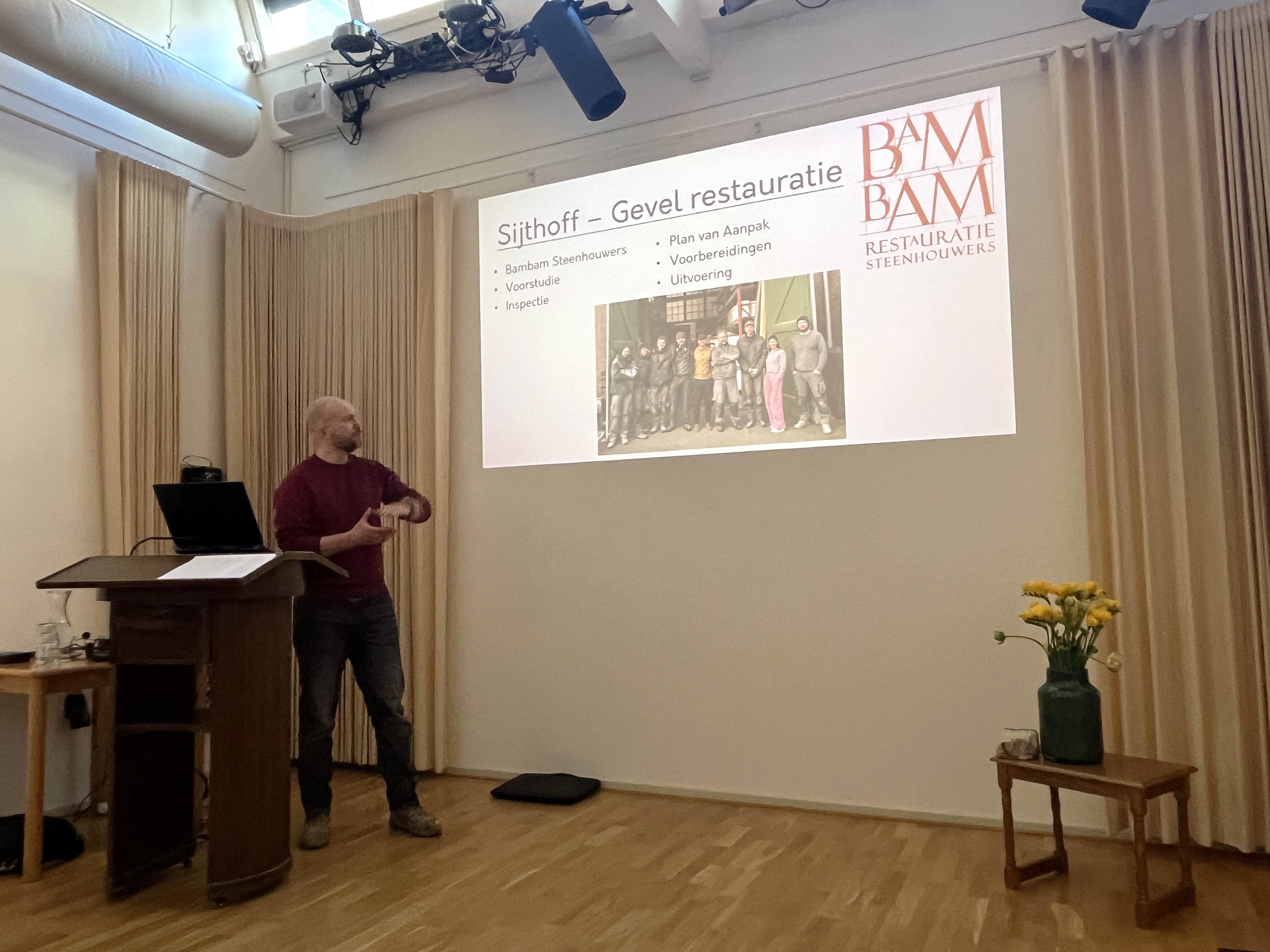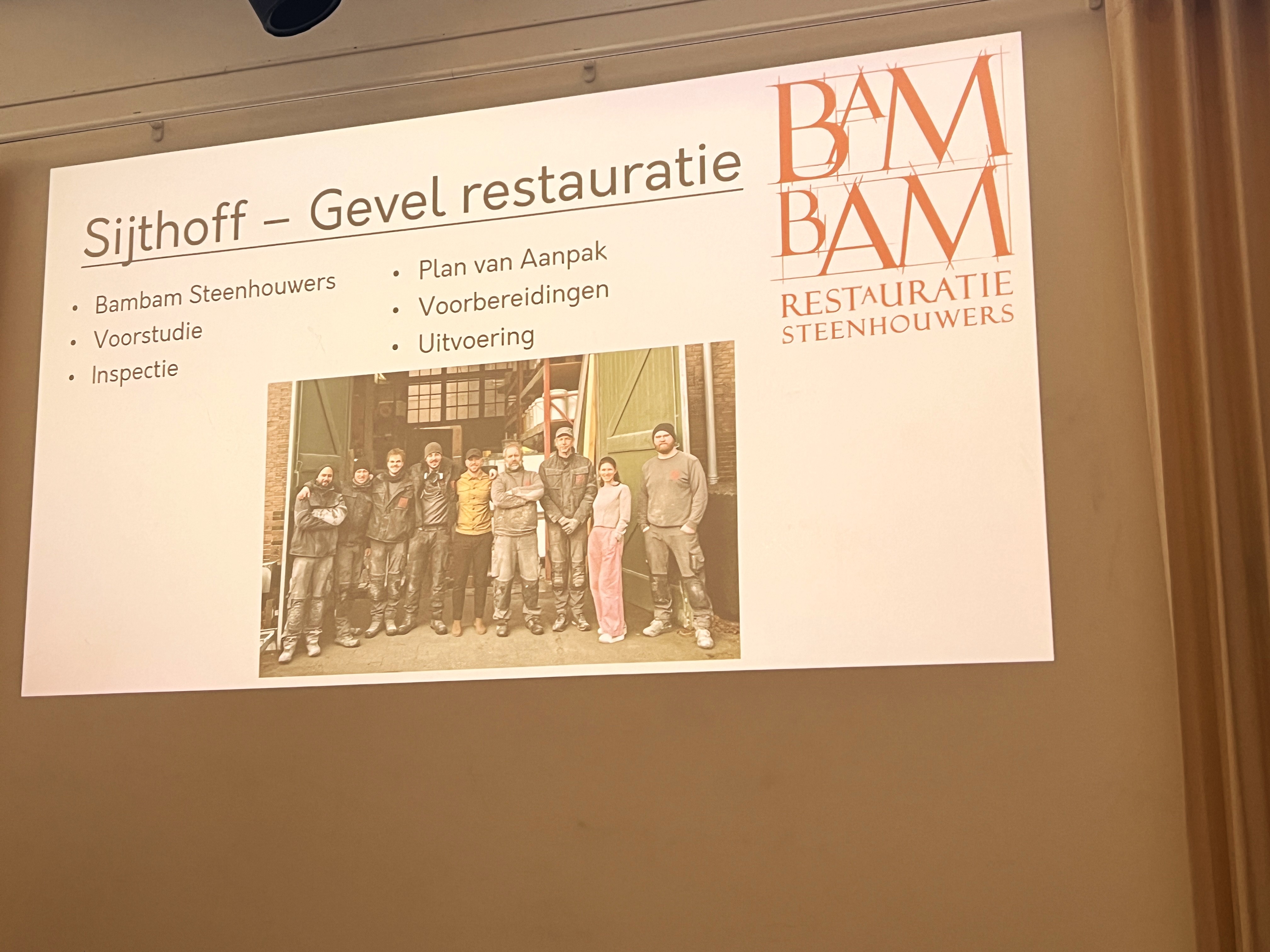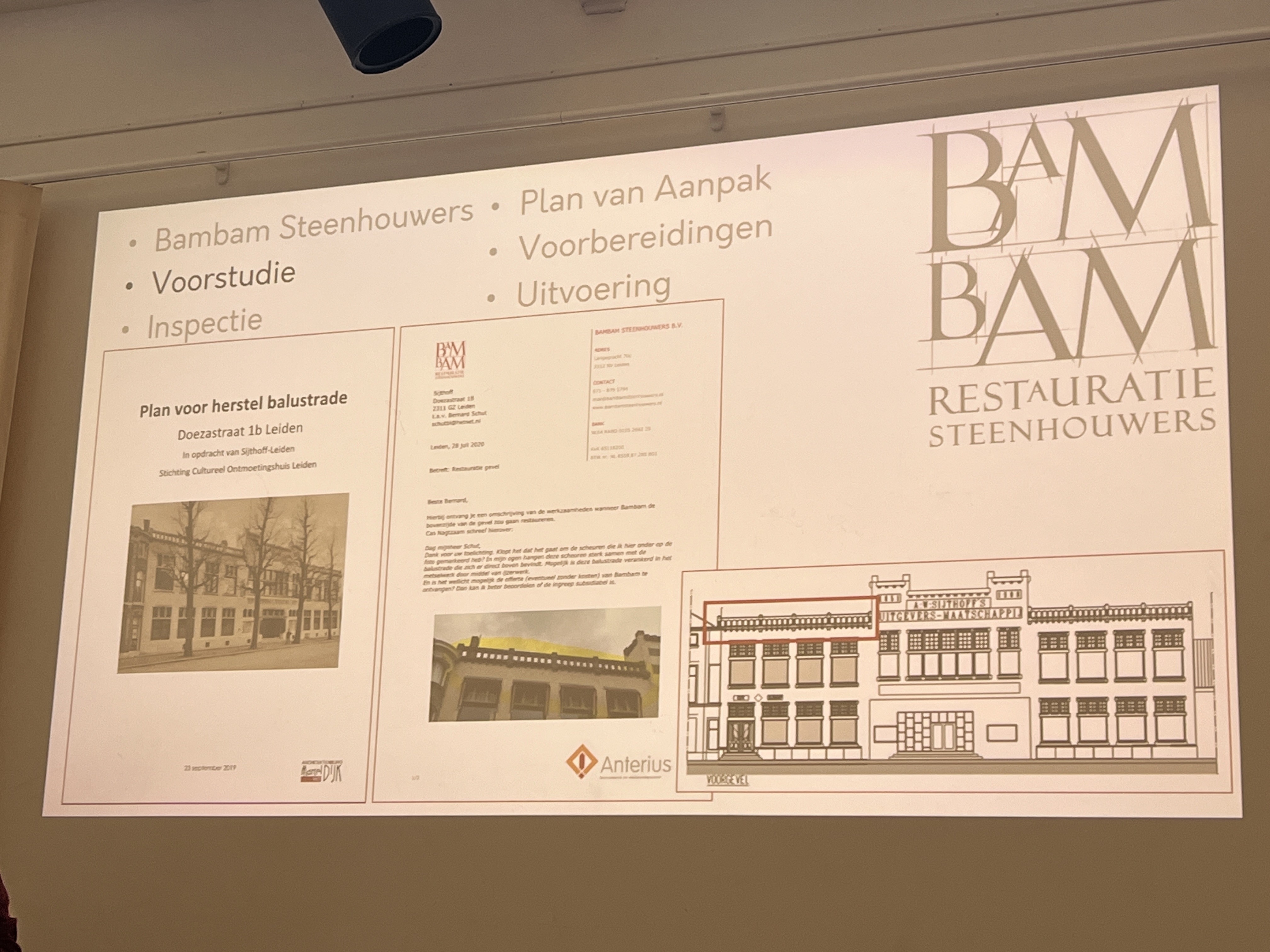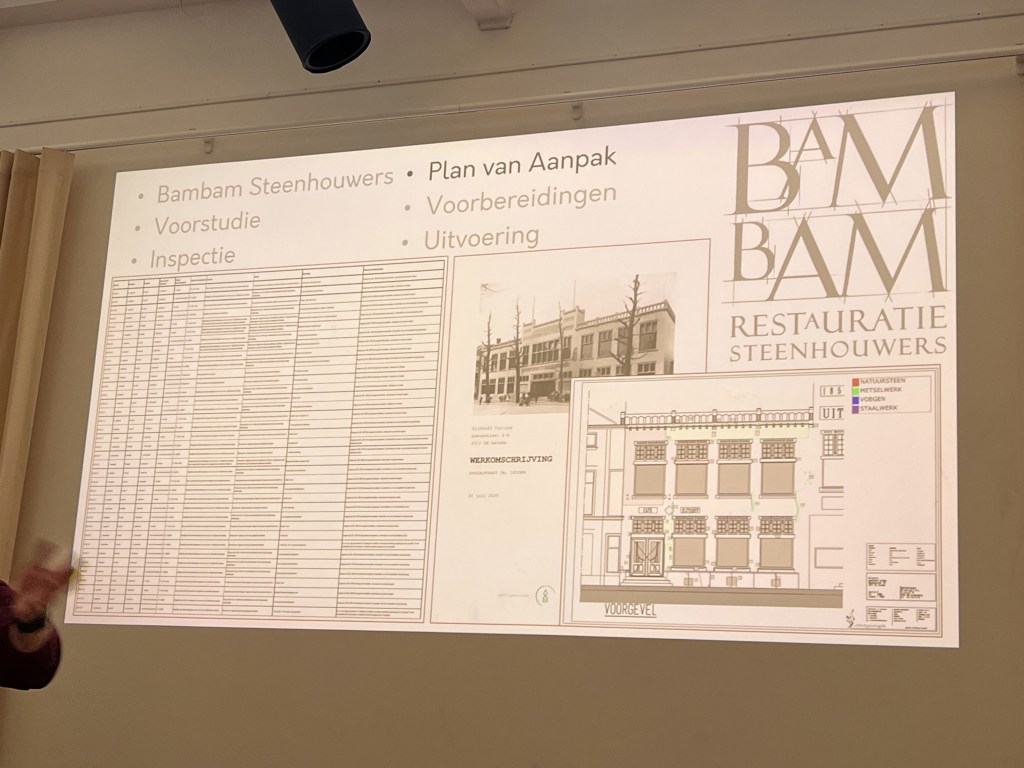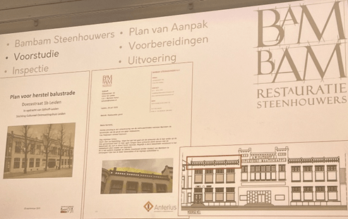 Sam Ezra Janse van Bambam Steenhouwers vertelt over de restauratie. Ongeveer vijf jaar geleden is de slechte staat van de gevel en de balustrade aan het licht gekomen. Er zitten breuken en scheuren in. Bambam volgt de volgende stappen: voorstudie, inspectie, plan van aanpak, voorbereidingen en uitvoering. Een aantal van deze stappen zijn reeds doorlopen. Er is onderzoek verricht naar de huidige toestand.